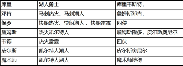 这里的链接球员包括:库里(对应韦斯特)、邓肯(对应詹姆斯)、保罗(对应四侠)、詹姆斯(对应四侠、邓肯、隆多)、韦德(对应四侠)、皮尔斯(对应奥尼尔)、魔术师(对应博得)。