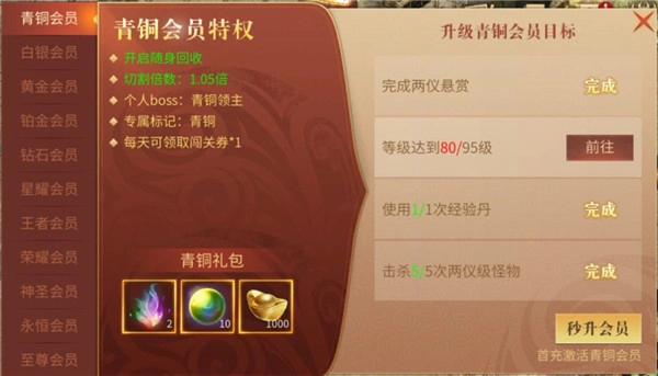 前面这些说的都是平民玩家常见的升级途径,要是玩家愿意付费,就能在游戏开服时第一时间入手首充礼包,直接获得铂金会员卡,这样就能进入前期好几个主要地图,而且礼包里附带的装备之类的道具,能让你在游戏前期抢先一步,一路领先!