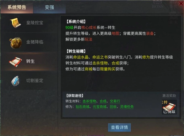 各转生等级都有对应的转生材料要求,大家在前期挂机打怪时就能自动收集到这些材料,所以前期完成一转和二转的过程还是相当快速且方便的。