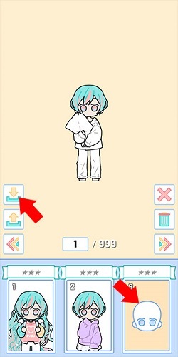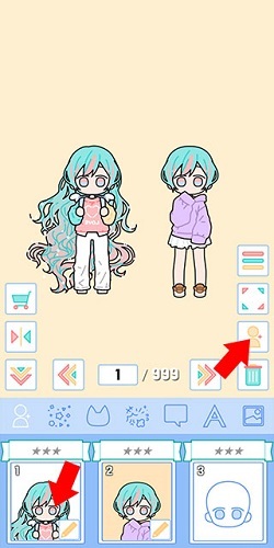 4、可以在角色选择界面看到自己之前保存的搭配了,点击即可将小人角色放置到屏幕上,长按角色可以拖动其位置,若需删除角色,只需将其拖至下方的垃圾桶按钮即可,若需返回搭配界面,同样点击右侧的第三个按钮即可。