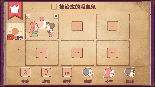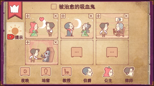 5、第五步把夜晚拉入第五个框中,然后把律师拉进去,再把公主也拉进去,这样吸血鬼公主就被治愈啦!
