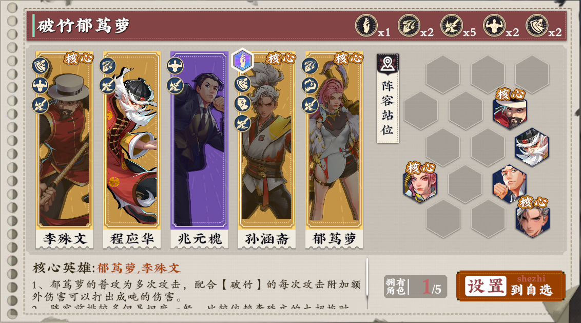 3、打发思路:郁茑萝的普攻为多次攻击,配合破竹】的每次攻击附加额外伤害可以打出成吨的伤害。阵容前排较多但是坦度一般,比较依赖李殊文的大招拖时间。