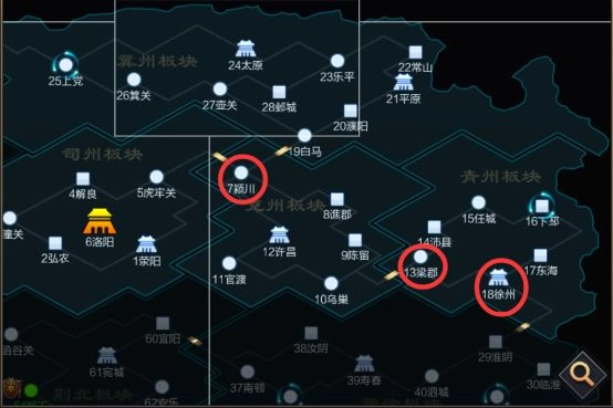 3、每个板块可通行方位,都在地图中有“亮光点”标注。(比如:18-徐州下方,13-梁郡旁边,7-颍川左侧与上方)