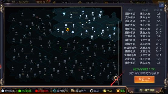 4、每个板块都有1-2个都城,占领全部都城该板块才归属我方军团,才能领板块特产,当然最好是完美占领最佳(也就是把板块内所有城池占完),因为板块特产会随机刷,特产刷到自己军团占的板块,如果是完美占领,全军团所有人可以领到不少元宝。