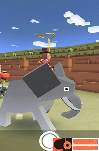 游戏开始的画面里,角色会骑着小野牛,套索在手,在地面上奔跑。长按画面不松开,等和前方动物距离较近时,向前滑动一下,就能瞬间跳过去。