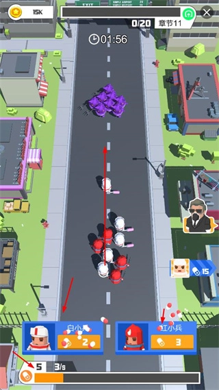 在街道场景里指挥不同类型的士兵与敌人对抗,要留意士兵数量、战斗时长和章节推进情况,通过合理安排来战胜敌人。