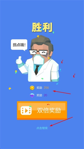 战斗获胜后,你能得到金币和钻石作为奖励,要是想获取双倍奖励,还可以选择观看广告。点击“继续”按钮,就能进入下一环节了。