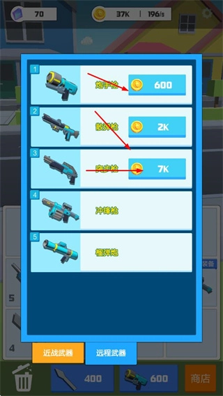 在商店里能买到各式各样的远程武器,游戏推进过程中会解锁更高级的枪械,花费相应金币就能增强战斗力。