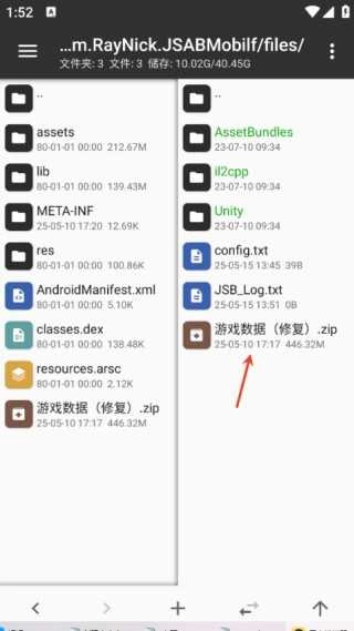 最后在右侧点击“游戏数据.zip”进行解压,遇到重复文件时选择替换即可。