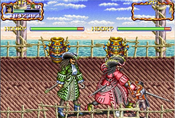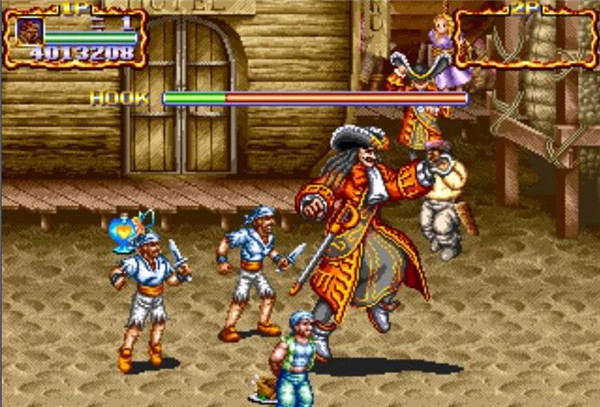 第六关:铁钩船长HOOK:终极BOSS,左手持剑右手铁钩的船长。招数用剑刺人,或者跳到跟前抓住人,然后又钩子捅,还有就是开枪,其实不是很难打,不是因为他强,而是会出现大量各种的帮手,还有第五关的BOSS总是后面的炮台开炮。(最后结局:战败逃跑。一会儿后回来。然而他的铁钩不慎卡在鳄鱼的肚皮里。结果HOOK被鳄鱼吃掉)