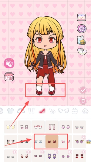 给穿红裙子的女孩选鞋子时,点击底部鞋类图标里的棕色凉鞋,再按照红色箭头的提示给角色穿上。