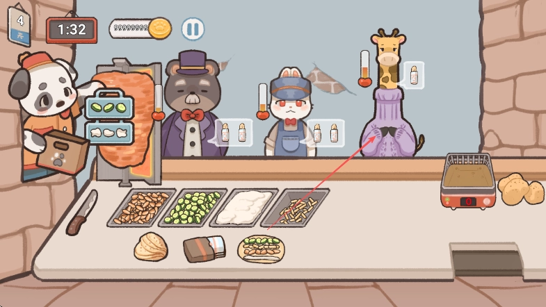 按照长颈鹿顾客的要求,把食材逐个加到面饼上制作餐点,要留意时间的控制。