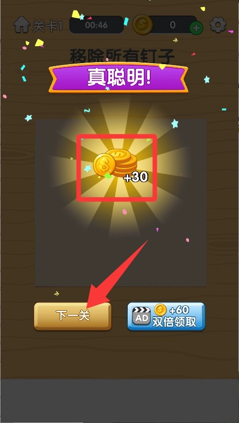 4、把所有的都拔完就能获得金币奖励,这些金币可以攒起来购买更趁手的工具,之后点击下一关就能继续挑战,越往后关卡的难度也会随之增加。