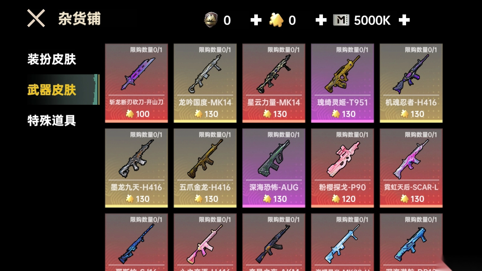 5、武器皮肤购买:墨龙九天-H416、深海恐怖-AUG、粉樱探戈-P90