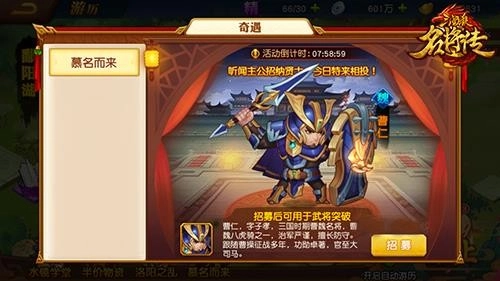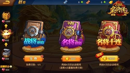 酒馆招募堪称获取武将最便捷高效的途径,毕竟在这里招到的武将,全是现成的完整武将卡,能直接拉去上阵作战!系统每天会免费送5次战将招募机会和1次名将招募机会,这可千万别错过使用。要是你是愿意投入的玩家,还能直接来个“名将十连抽”,说不定能直接拿到高品质的橙将甚至红将呢。