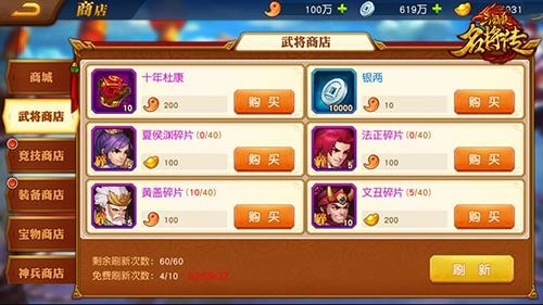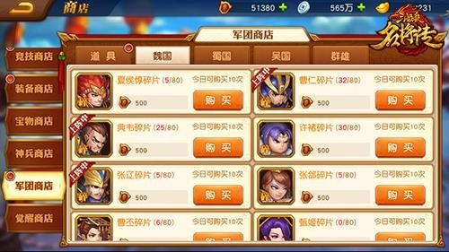 在武将商店里,玩家能够购买到各个阵营中品质达到紫色及以上的武将碎片,以及完整的武将卡片。