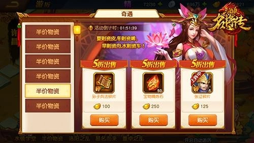 游历玩法里的奇遇事件“半价物资”有概率刷出武将碎片,奇遇事件“慕名而来”则能直接购买到完整武将。