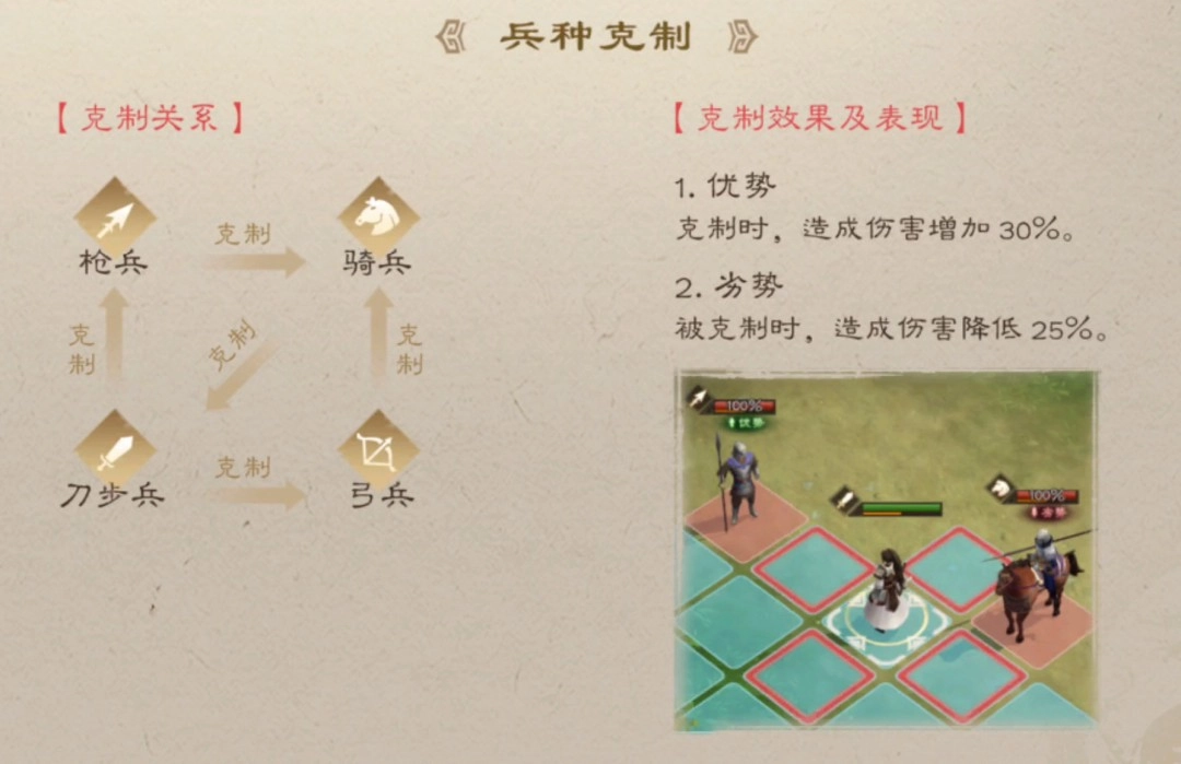 在新曹操传里,武将的兵种选择至关重要。每个兵种都自带独特特性,随着兵种不断升阶,这些特性会逐步解锁;同时部分兵种存在交战克制关系,比如枪兵克制骑兵、骑兵克制刀步兵等——由于新三曹没有传统战棋的三色互克设定,这种兵种克制就显得格外关键,30%的伤害提升绝非虚言;此外,不同地形会影响兵种的移动力消耗,这一点也需要提前留意。