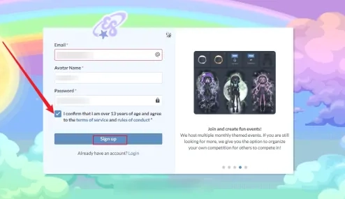 如图所示勾选同意【注册条款】,接着点击【Sign up】按钮,即可完成注册流程。
