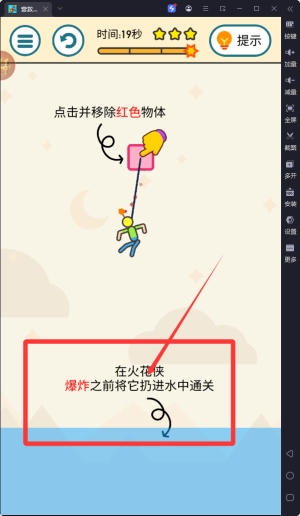 玩家需要仔细观察关卡的布局,按照提示找到关键的红色物体并点击它,帮助火花侠掉入水中,从而完成救援任务。
