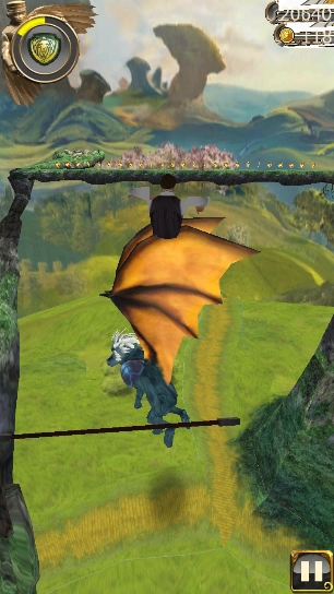 点击向前滑动可控制角色执行跳跃操作,此操作能让角色进入滑索状态;同时,玩家通过重力感应左右倾斜手机,来控制角色左右移动,完成收集各类钱币以及躲避狭窄道路的动作。