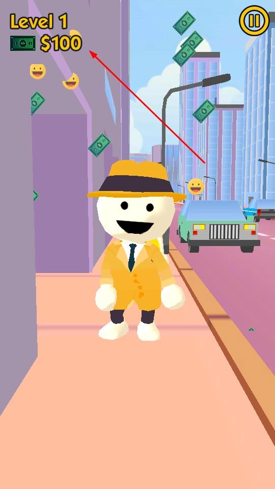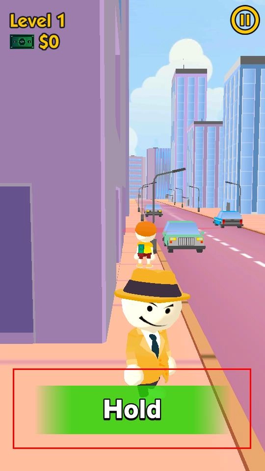 进入Level 1的城市街道场景后,点击底部绿色标有Hold的按钮,触发与前方目标角色的互动机制,正式开启夺金挑战流程。