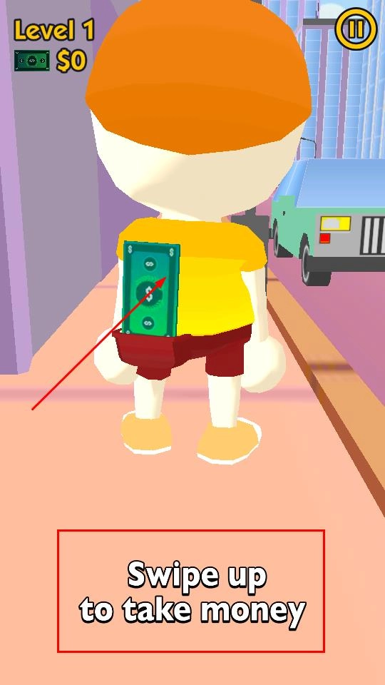当靠近目标角色——其身着黄色衣物且背部带有钱币标识时,按照界面提示“Swipe up to take money”,执行向上滑动的操作,即可完成夺取该角色身上钱财的动作。
