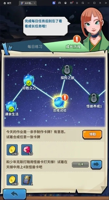 第一种方法:先打开任务界面,切换到成长历程板块,完成“课余生活”和“好胜之心”这两个任务后,进入合成实验页面。此时你会看到,制作一张卡牌并完成对应的任务,就能获得50钻石的奖励。
