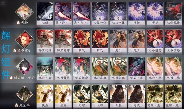 下面是辉灯组件,犬神、酒吞偏向伤害输出,呪刀、鬼金羊这类偏向快攻打法,具体选择要结合版本环境来定。