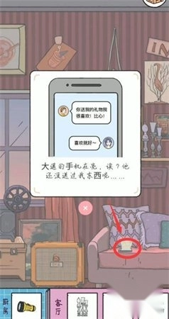 进入客厅后,能在沙发上找到大遥的手机(此处可能为游戏内设定角色或物品名称)。