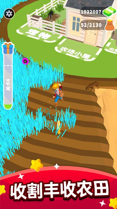 《收割大师》是一款以庄稼收割为灵感的解压模拟休闲游戏。玩家需要尽快收割成熟的庄稼,为下一季度的种植做准备。通过滑动屏幕操控角色移动到农场区域,角色会自动挥舞镰刀收割农作物,收集的作物可在市场出售换取金钱。利用积累的资金,玩家可以扩建农场、升级装备,从而提升收割效率。此外,游戏还加入了宠物养育系统,搭配畅快的割草体验,为玩家带来更多惊喜乐趣!