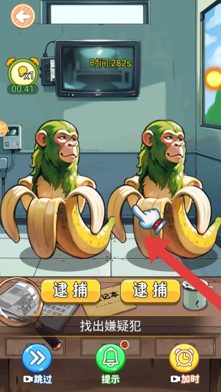 根据任务目标要求:锁定嫌疑对象,画面中呈现两只被香蕉皮包裹的拟人化猴子,此关卡属于找不同或推理辨别类型,需通过找出猴子之间的差异来确定嫌疑犯。