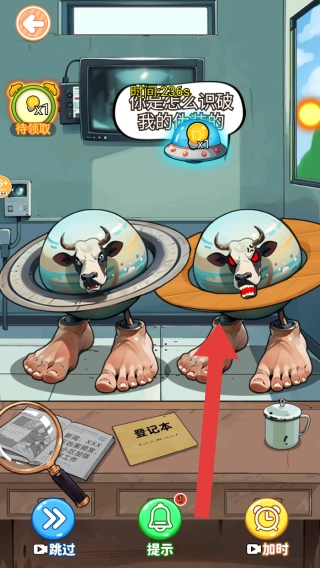 展示“你是如何看穿我的伪装的?”的对话气泡,呈现两个拟人化的牛头形象,它们佩戴着不同的圆形装置,这是一个找不同推理关卡,需要通过观察差异来识别伪装。