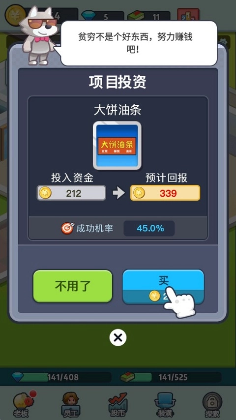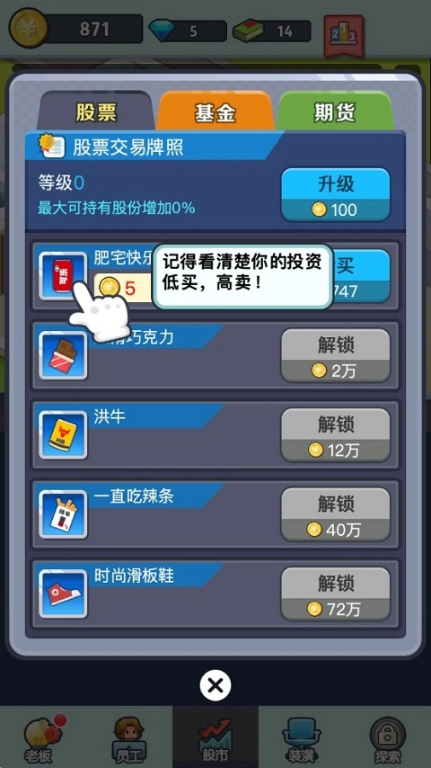 《老板赚大钱》这款游戏的项目玩法十分丰富,其背景设定取材于现实商业场景。游戏中,玩家不仅可以聘请员工,还能进行办公室装修、股市投资以及商业探索等操作。通过更换办公室的设施,能够有效提升员工的赚钱效率,延长他们的暴走状态时长,进而提高整体工作效能;合理利用股市中的股票、期货和基金等投资工具,则可以帮助玩家快速获取额外收益;此外,完成各类探索任务,不仅有机会发现更优质的投资项目,还能招募到更为出色的员工。 除了上述商业经营相关的玩法外,玩家还能通过快速点击屏幕的方式来赚取资金,点击赚钱的速度取决于老板自身的能力属性。在角色设定系统中完成升级,能够提高点击屏幕时的单次赚钱额度。类似的升级途径还包括自动交易、大买卖、激情演讲等多种方式。对这款游戏感兴趣的玩家,可千万不要错过体验的机会哦!