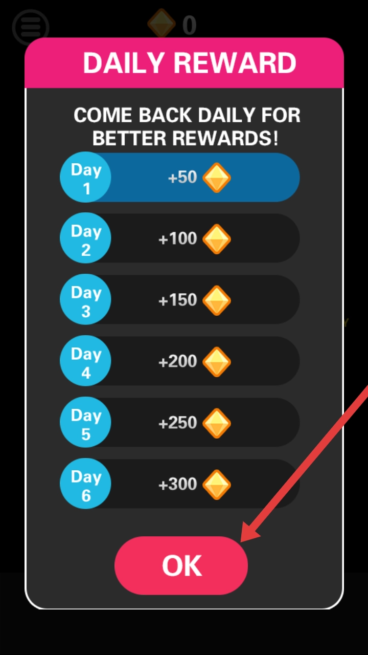 进入每日奖励界面,查看【DAILY REWARD】的规则说明,每日登录都能领取钻石,确认后点击下方的【OK】按钮即可完成领取。