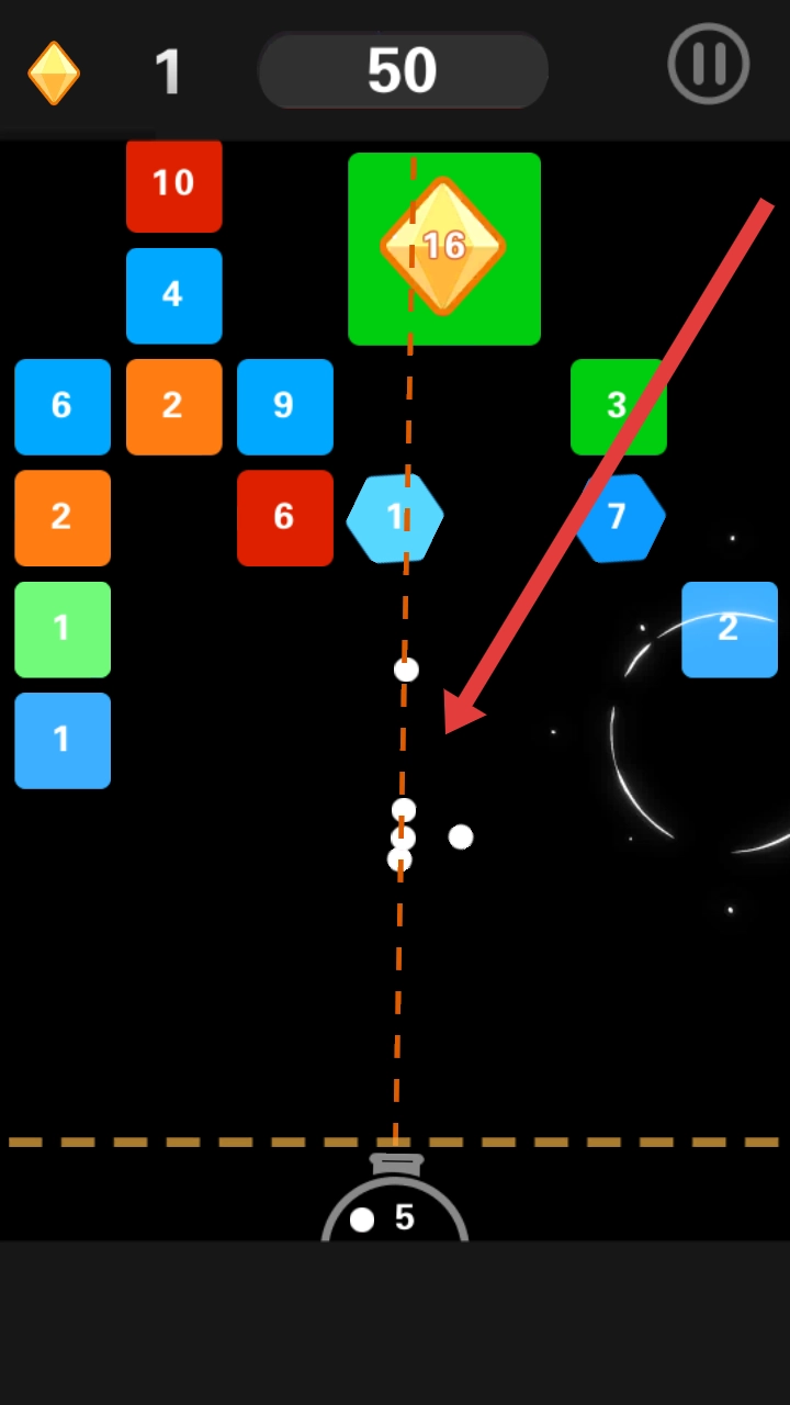 在游戏里瞄准并发射白色小球,它会顺着虚线撞击带有数字的砖块和绿色钻石方块,以此消除砖块、收集钻石并提高分数。
