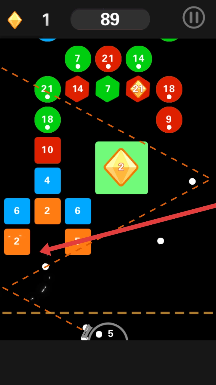 借助小球的反弹原理,规划那条橙色虚线所示的运动轨迹,引导小球去撞击箭头所指的橙色方块(标有数字2的那个),以此通过反弹来清除更多砖块,力求突破更高分数。