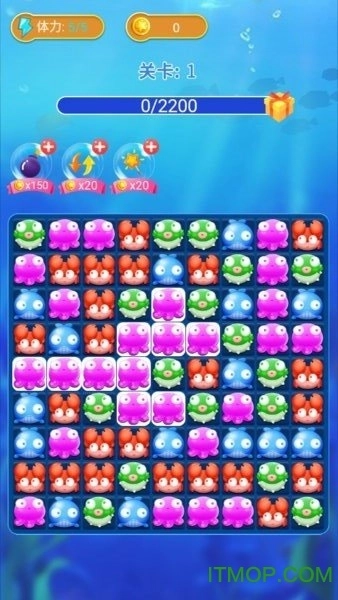 1.把三个及以上相同图案的小鱼连在一起就能完成消除。每次消除都会给你的“攻击炮台”累积能量,等能量攒满,炮台就会自动发射水弹,攻击上方的鲨鱼BOSS。