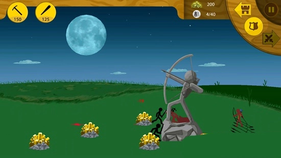 屏幕右上角设有三个按钮,其中向左的箭头按钮被点击后,所有火柴人都会退守至基地后方。当敌人发起攻击时,仅有弓箭手能够对敌人进行攻击,但这也会导致我们的基地出现损耗。