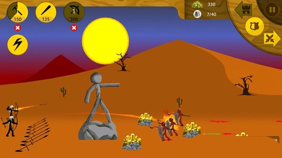 只要矿石数量充足,就可以点击攻击型火柴人,让它们去摧毁敌人的基地。