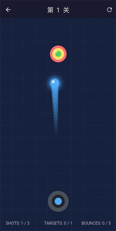 1、拖动进行瞄准,松开手指发射小球,使其在墙壁之间不断反弹,直至击中所有目标。