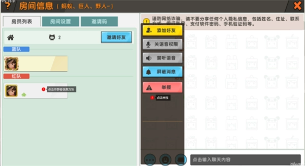 2、在房间信息左侧的玩家列表里,找到作弊玩家后点击其信息方块,接着点击【举报】按钮进行举报。