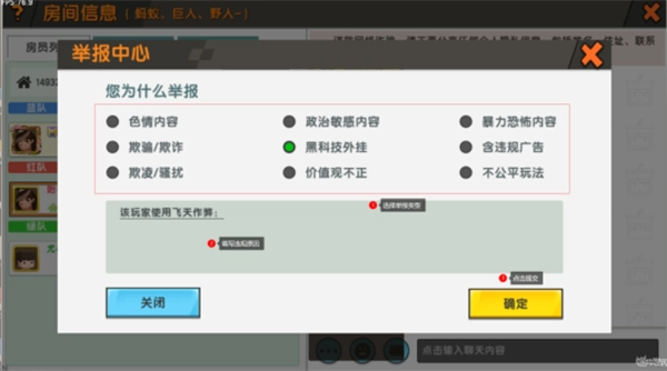 3、在举报类型中选择“黑科技外挂”,接着在下方的输入框里填写该玩家具体的作弊行为,最后点击【确定】按钮即可完成操作。