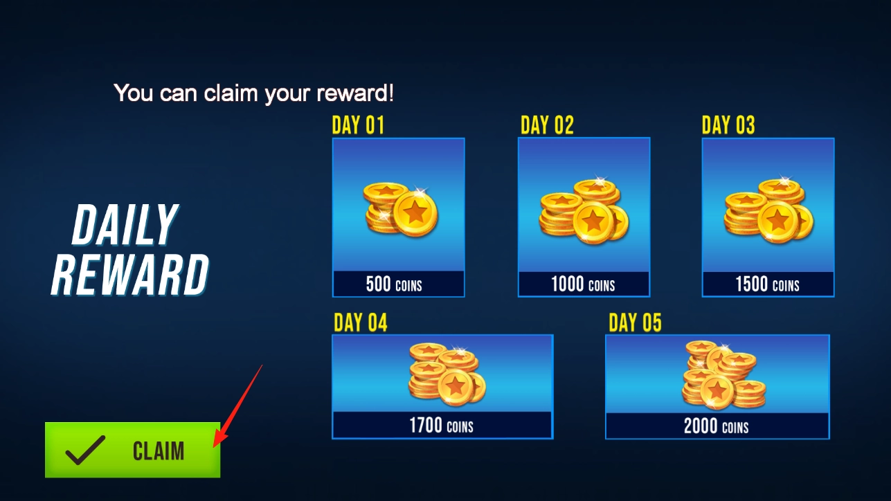 界面呈现每日奖励内容,根据玩家的登录天数设定不同档位的金币数额。当玩家进入该界面后,点击绿色的CLAIM按钮,系统会按照其当前累计的登录天数,发放相应数量的金币。