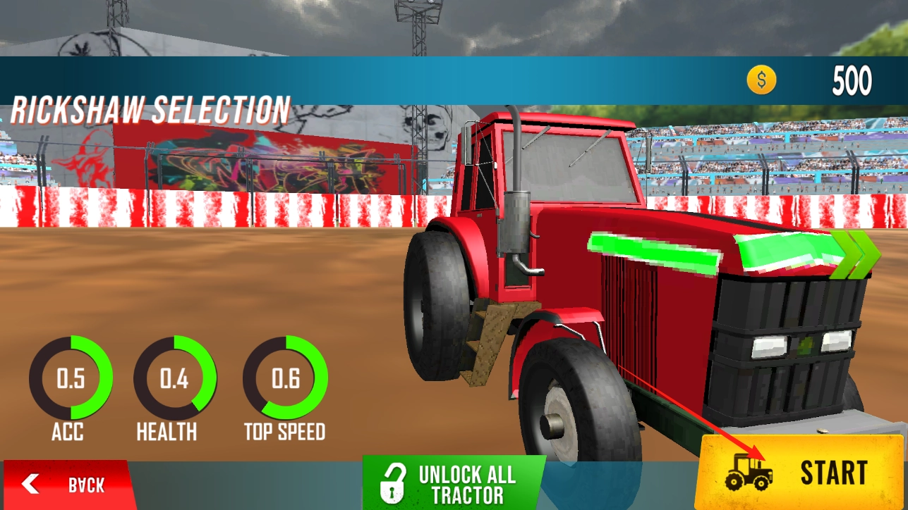 进入拖拉机选择界面,选定红色拖拉机后,查看其加速、耐久、极速属性,确认使用该拖拉机,点击黄色START按钮,进入对战场地。