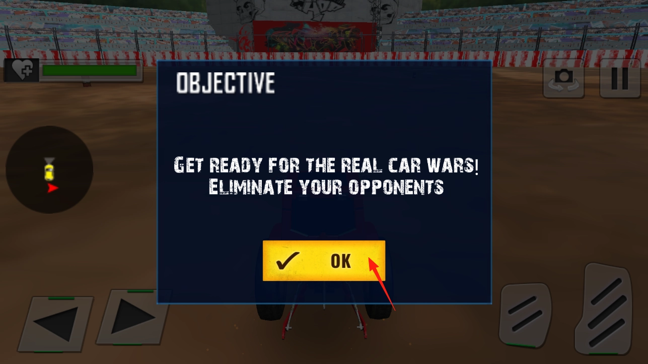 游戏会弹出对战目标提示框,提醒玩家即将开启真实的车辆对战,需要通过淘汰对手来取胜。玩家点击黄色的OK按钮后,提示框会关闭,拖拉机撞车竞技便正式开始。此时玩家可操控拖拉机在场地内移动,寻找其他对手进行碰撞对决。
