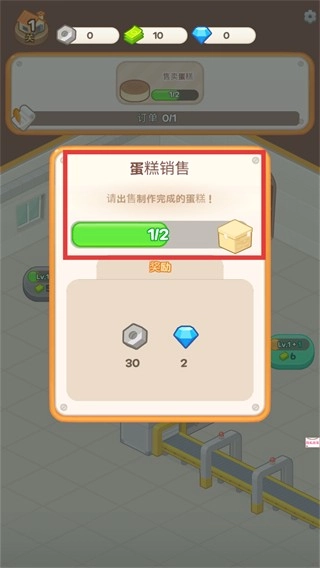 1、打开蛋糕销售订单后,需要售出2块蛋糕方可领取奖励,以此积累资源,为后续的设备升级做准备。