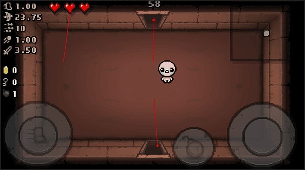 2、左边用来操控方向,右边负责控制攻击,左上角的红心代表你的剩余生命值,走到门前进入下一个房间即可开启战斗。