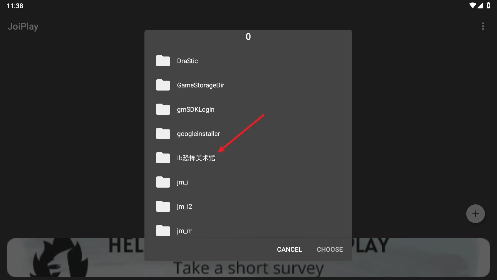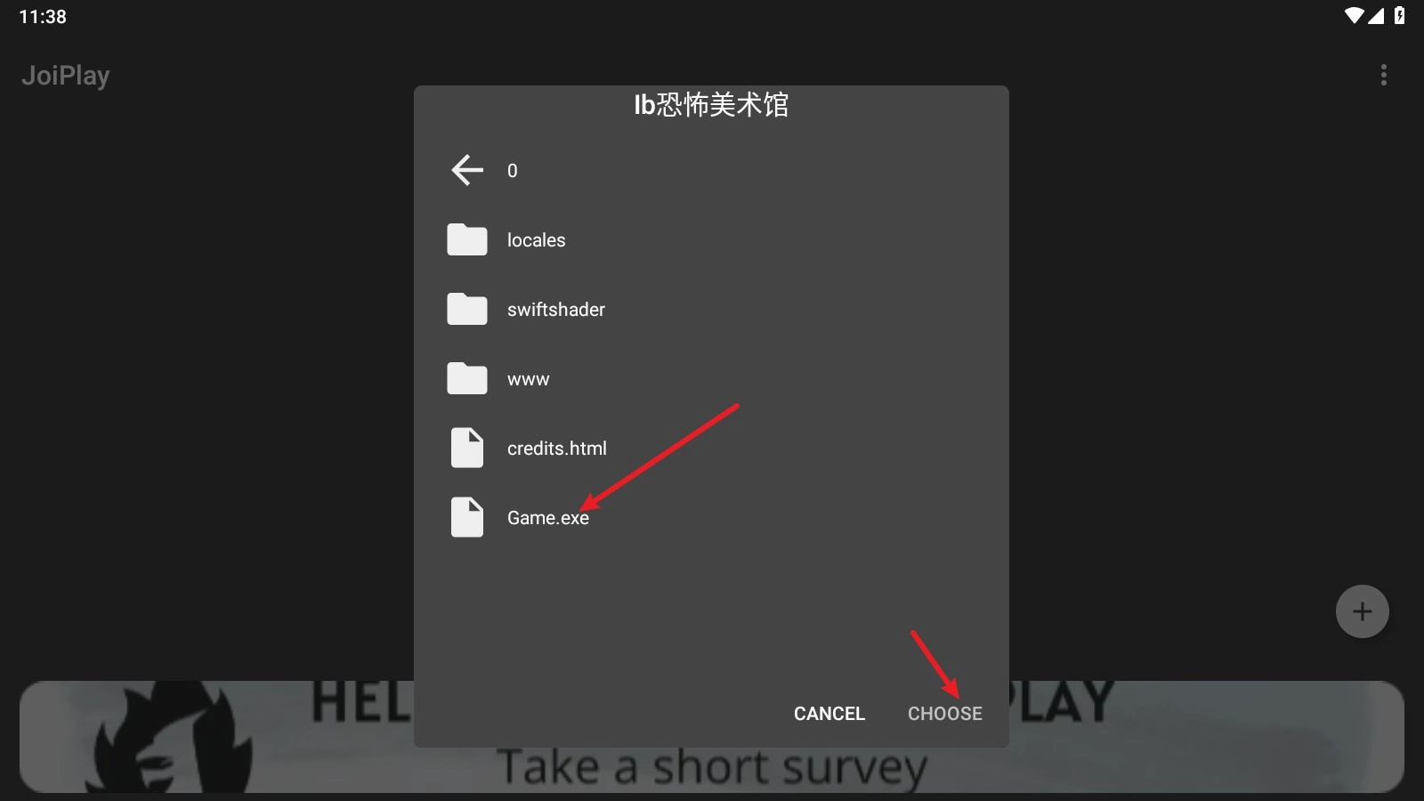 运行可执行文件后点击“choose”按钮,接着找到“Ib恐怖美术馆”文件夹,进入该文件夹后选中“game.exe”文件,之后再次点击“choose”按钮。