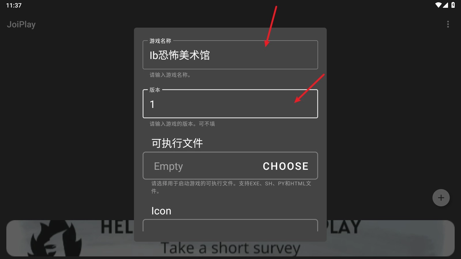 随后在游戏名称栏填Ib恐怖美术馆,版本号填1。